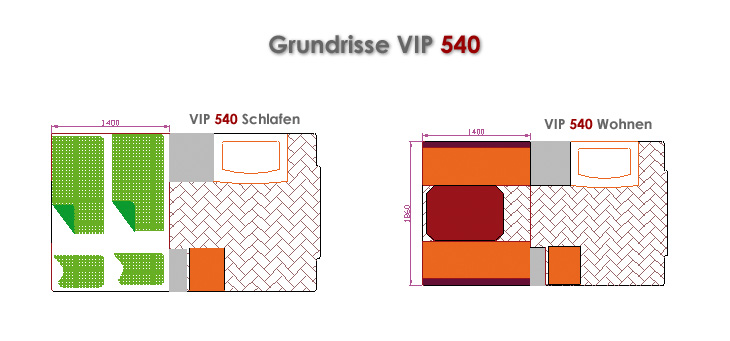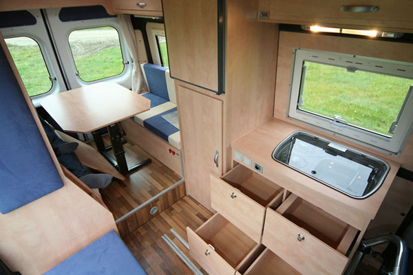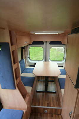 Fahrer- und Beifahrersitz drehbar, Sitzbezüge für Originalsitze in Wohnraumstoff, jeweils eine Armlehne |