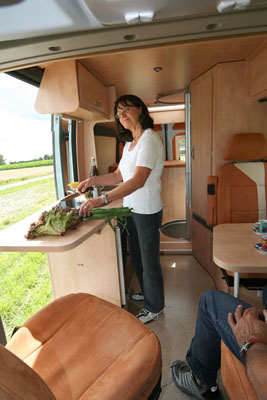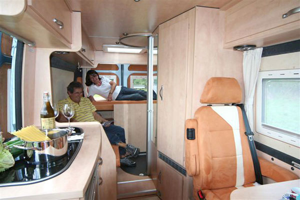 Fahrer- und Beifahrersitz drehbar, Sitzbezüge für Originalsitze in Wohnraumstoff, jeweils eine Armlehne |